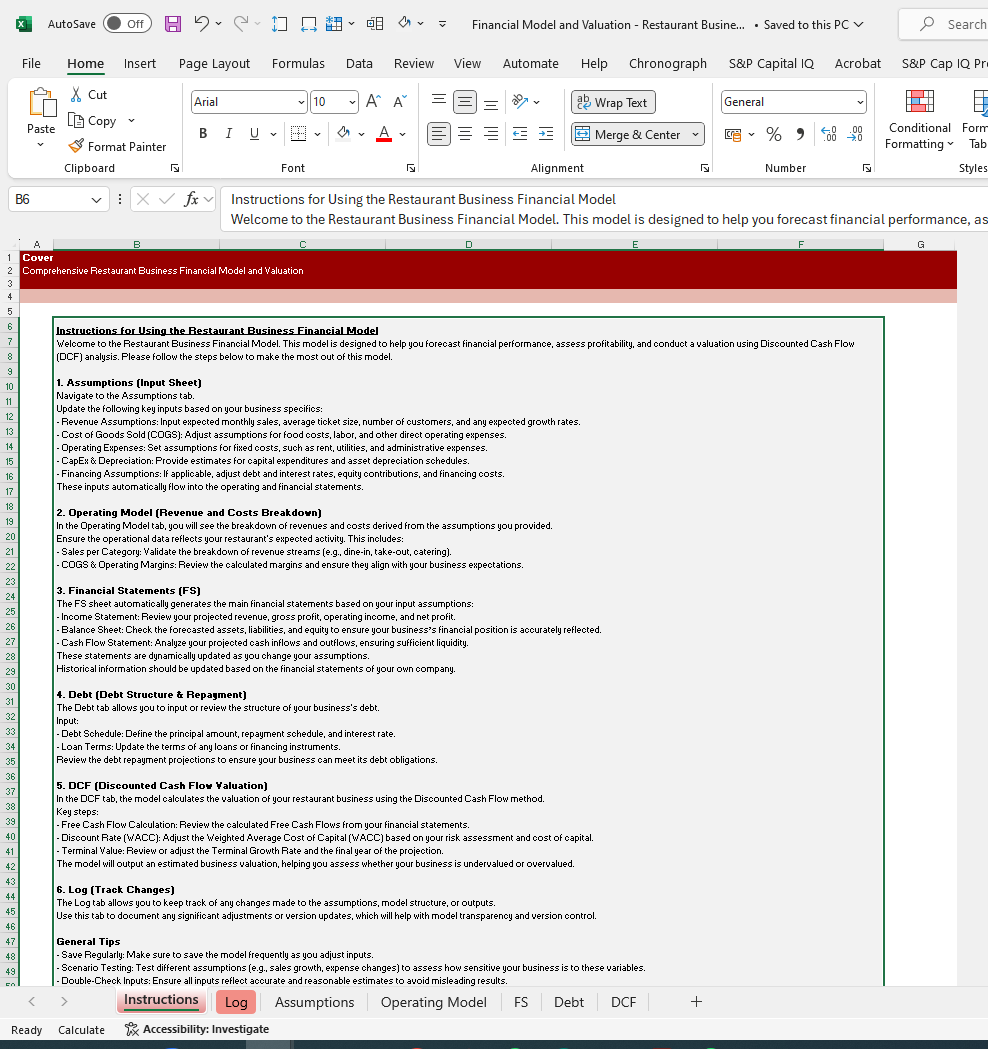 Discover the Comprehensive Restaurant Company Financial Model and Valuation Excel Spreadsheet Template, an essential tool designed to empower investors, entrepreneurs, stakeholders, finance enthusiasts, and many others in making well-informed decisions within the restaurant industry. This sophisticated financial solution offers integrated statements, precise revenue insights, detailed expense breakdowns, and strategic capital expenditure planning. With scenario exploration, comprehensive debt analysis, advanced DCF valuation, and risk assessment, you’ll gain the edge you need for confident decision-making. Generate professional investor reports effortlessly and easily customize the model to match your unique needs. Transparent, reliable, and tailored, this model is your key to navigating the restaurant industry and can easily be adapted to any other industry.